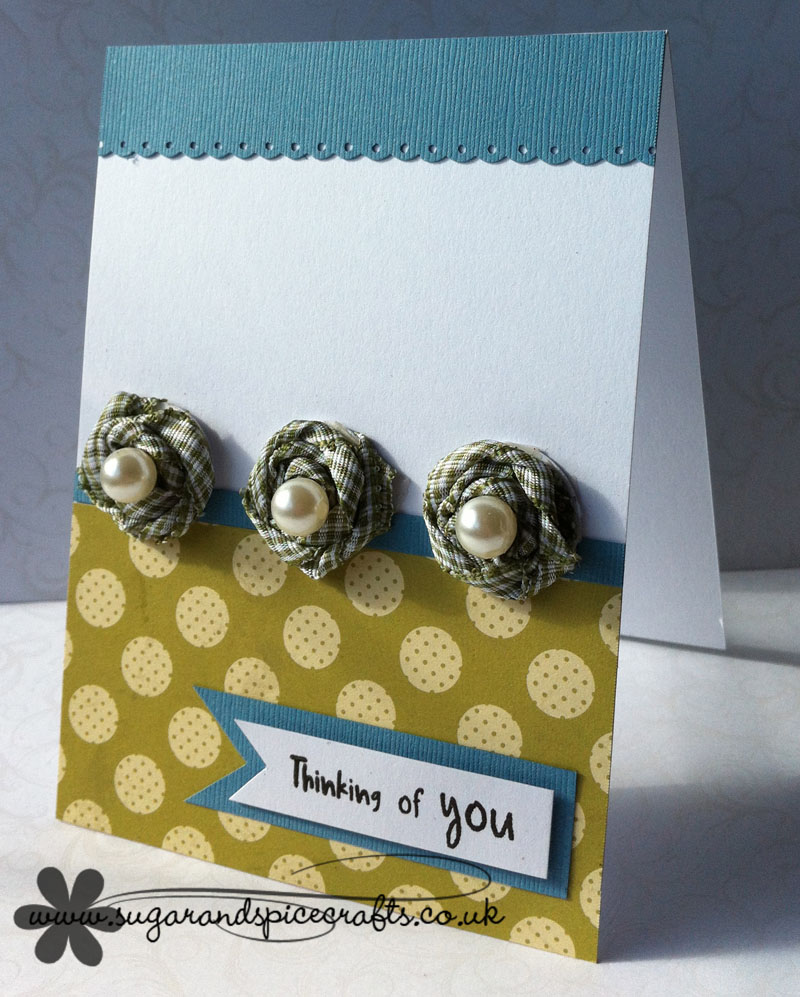 Do this to all three, I then added a yummy pearl to each one, and taking some of your scrap bits (the whole reason why you should never throw bits away) attach to your card, add sentiment and proudly place your twisted ribbon flowers on.